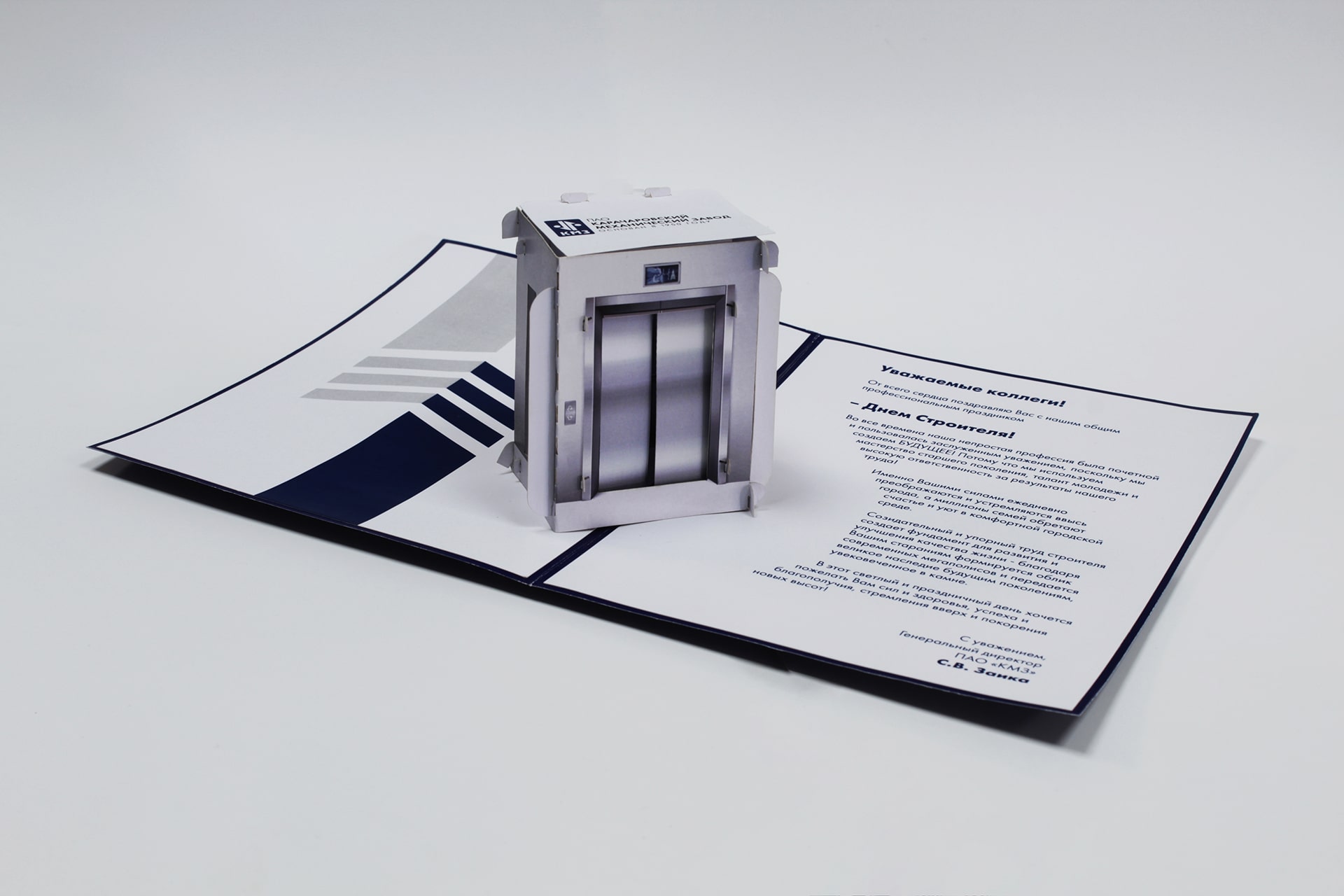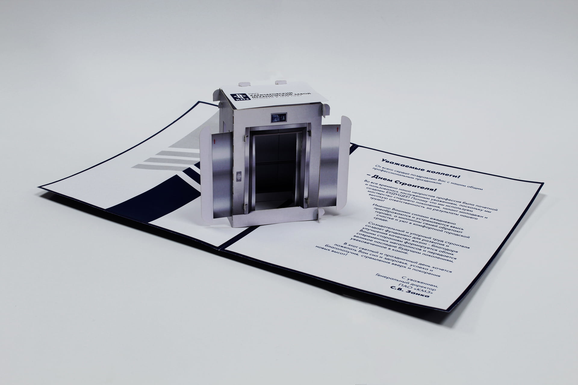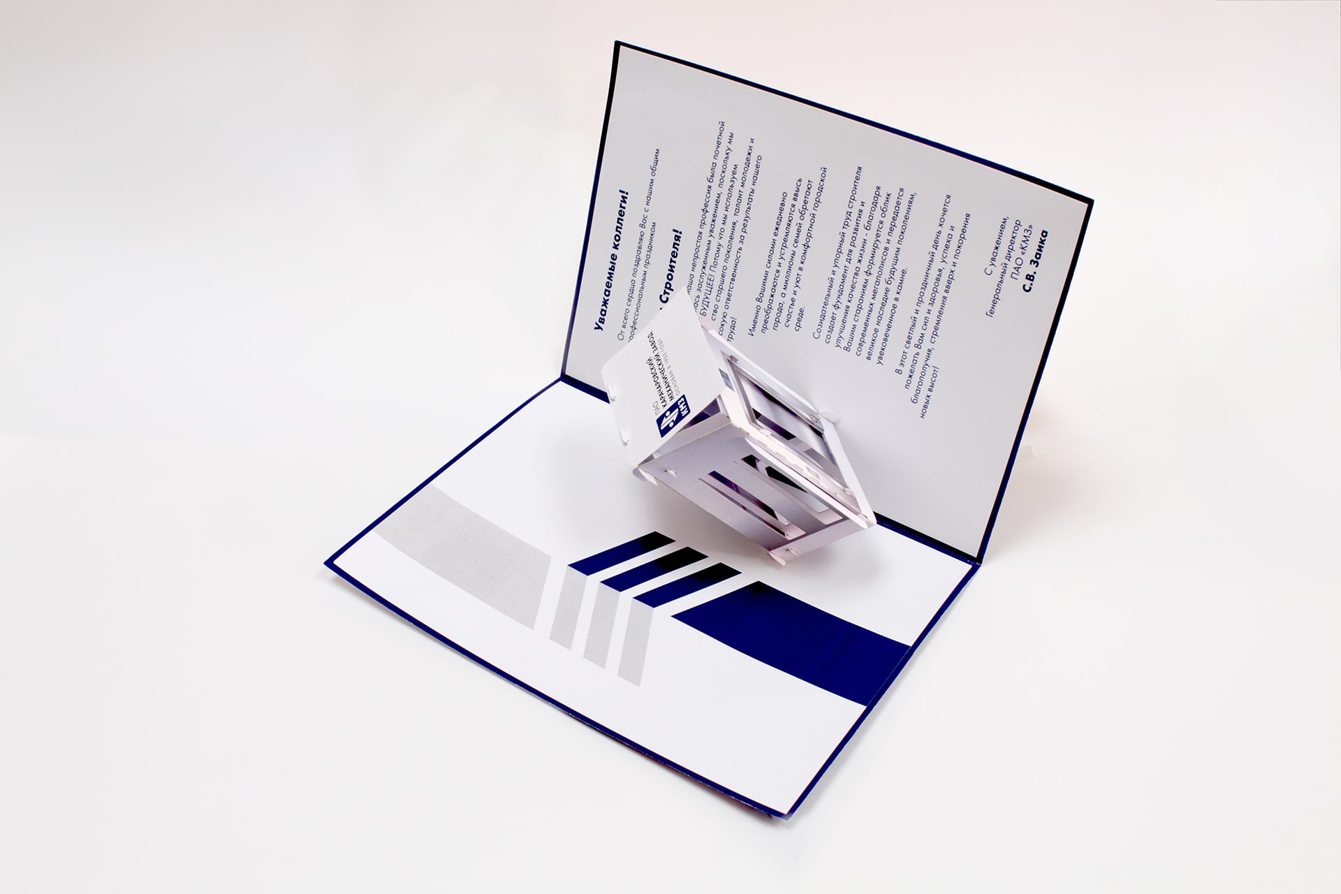 Объемная Pop-up открытка на День Строителя для компании ПАО «КМЗ»