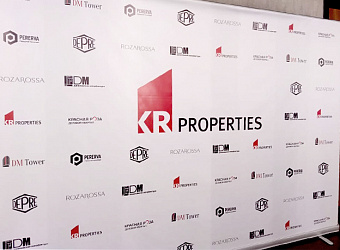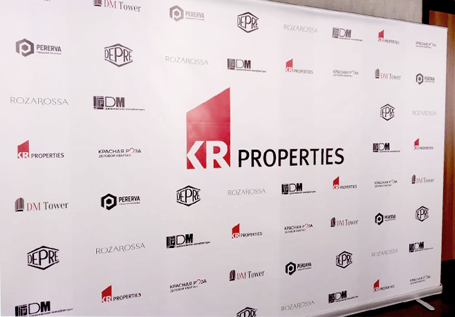 Ролл ап (roll-up) – это по сути визитка, которую мы можем изготовить в любом масштабе. Например, для девелоперской компании KR Properties был выбран нестандартный размер 3х2 метра. Такие параметры позволили разместить на полотне все необходимые логотипы — получился полноценный стильный пресс-волл, да к тому же еще и мобильный!