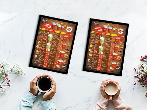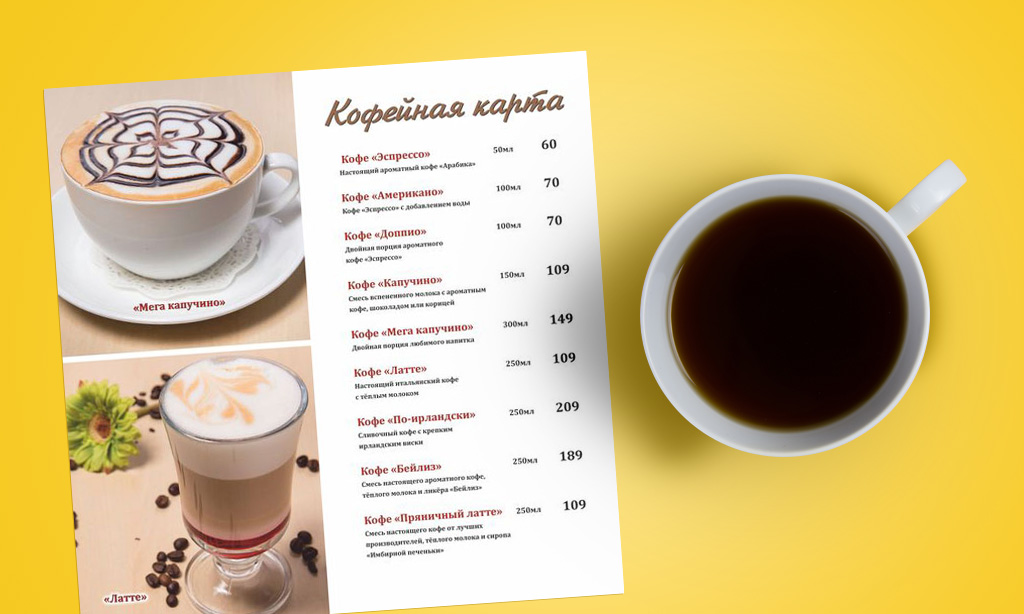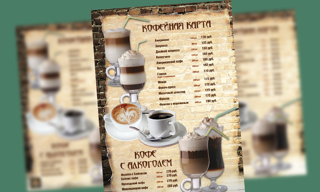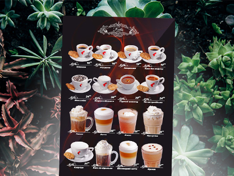 Чаще всего кофейная карта выполняется в виде отдельного листа из плотной бумаги или картона. Для более презентабельного вида такие карты могут вкладываться в специальную папку, которая оформляется соответственно общему стилю заведения.