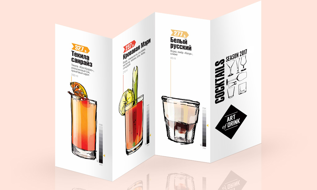 Чаще всего коктейльная карта выполняется в виде отдельного листа из плотной бумаги или картона. Для более презентабельного вида такие карты могут вкладываться в специальную папку, которая оформляется соответственно общему стилю заведения.