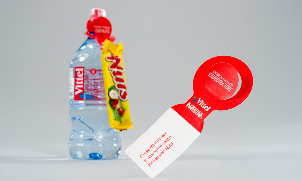 - имиджевая промо-этикетка, дополнительно размещаемая на продукте (например, на горлышке бутылок) — такой вид промо-этикеток может быть различной формы и конструкции