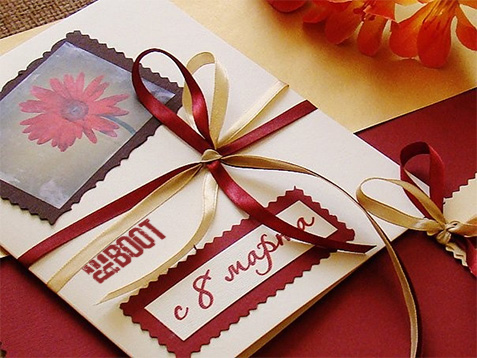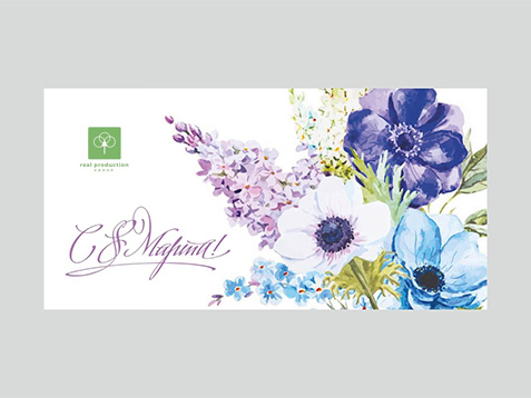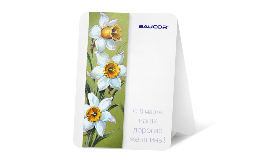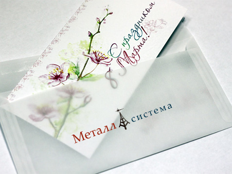 Корпоративные открытки на 8 марта отличаются от прочих тем, что их оформление носит тематический весенний характер. В оформлении таких открыток очень часто используются цветы.