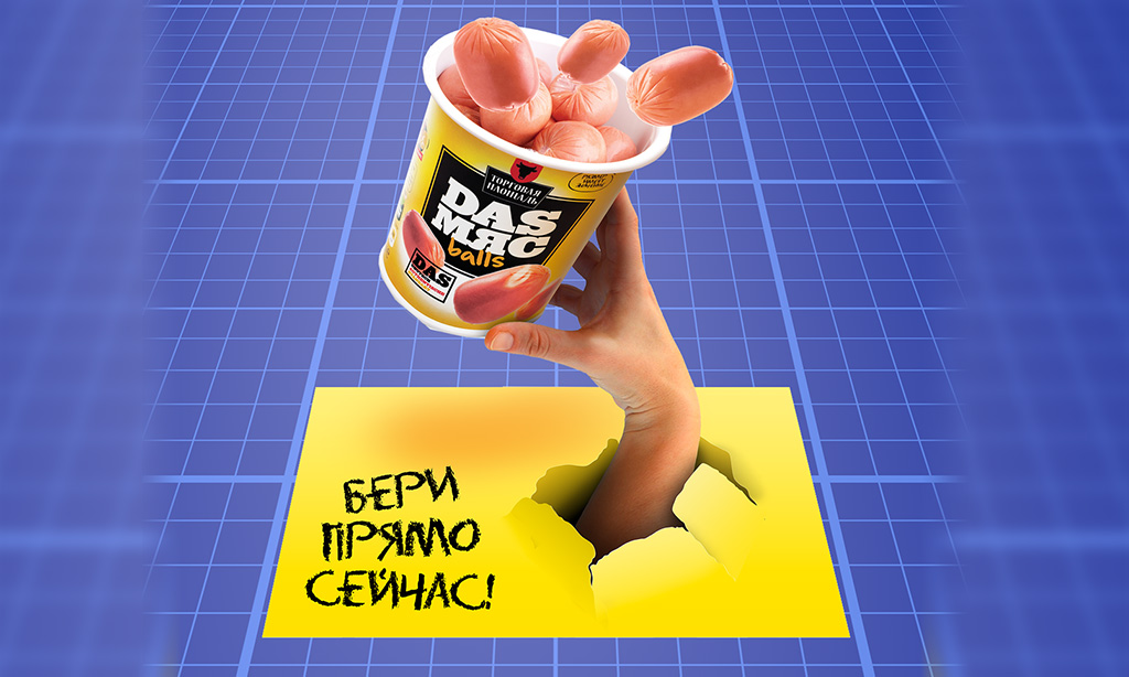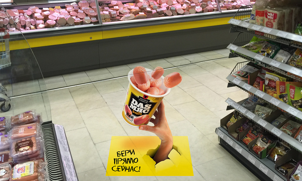 Основная идея для визуализации стикера родилась непосредственно из слогана рекламной кампании: «Бери Прямо Сейчас». Наши дизайнеры «покрутили» эту идею во всех направлениях, и в результате предоставили заказчику данную визуализацию — эффектный напольный 3D стикер, на котором рука утаскивает упаковку сосисок прямо из-под ног у потенциальных покупателей.