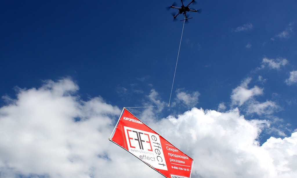 И вот рекламный принт поднимается в воздух. Сначала на односторонней легкой раме, а затем и на трёхсторонней, созданной нашими технологами и прекрасно просматриваемой с любого ракурса. Точный расчёт соотношения массы и формы рекламных конструкций к мощности и управляемости дронов позволил нам избежать участи первых воздухоплавателей и полностью сохранить контроль над происходящим. Констатируем: дронвертайзинг освоен!