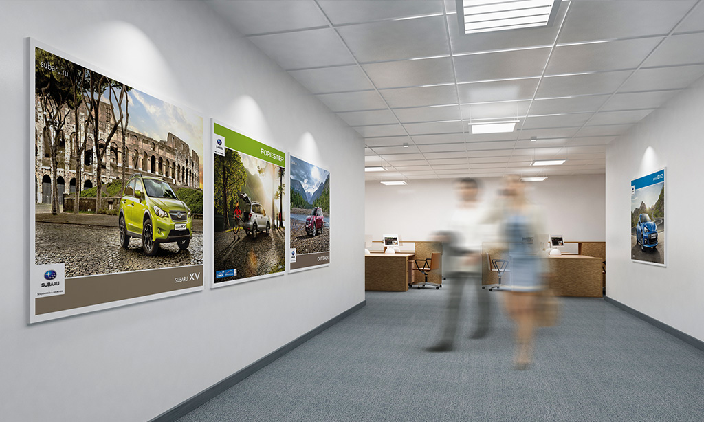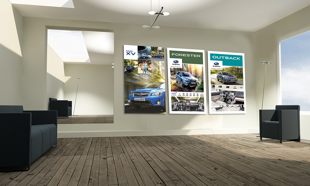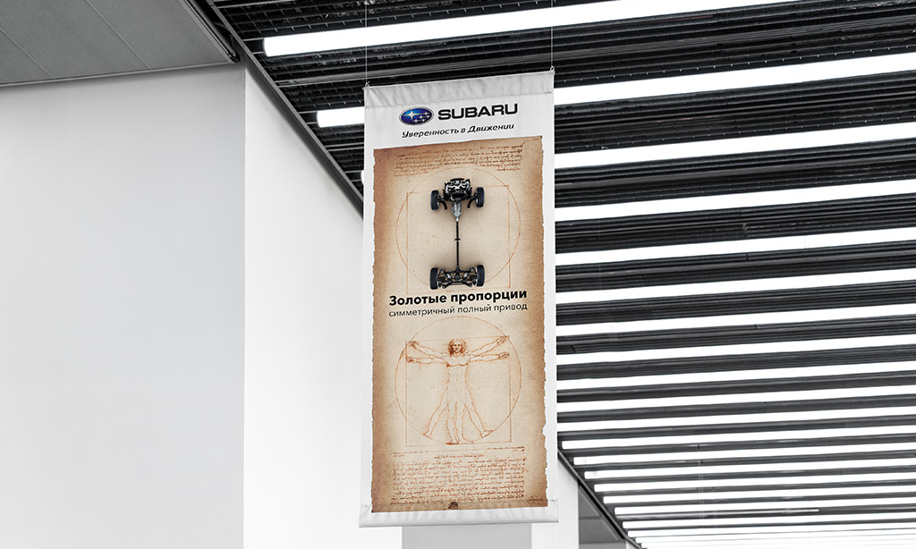 Особенностью этого проекта стала разработка indoor рекламы на основе существующих POS-материалов. В то же время мы должны были удержаться в рамках существующих требований к дизайну интерьера, продиктованных компанией Subaru.