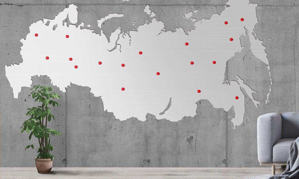 Также мы составили проект индивидуальной карты, с возможностью отмечать города, где есть представительства компании НАК. Дизайн карты был разработан с учетом общего стиля оформления помещения.