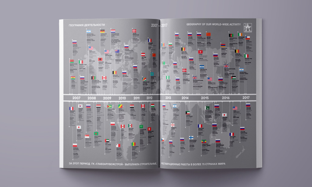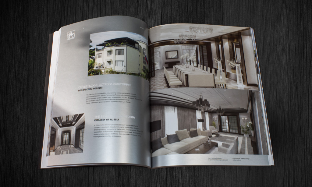 На первом этапе работ по этому проекту нам в руки попали начальная недоработанные эскизы каталога «ГлавЗарубежСтрой». Поскольку общая визуальная концепция полностью устраивала клиента, нам нужно было лишь довести до совершенства дизайн-макет каталога и весь внутренний контент на основе предоставленных материалов.