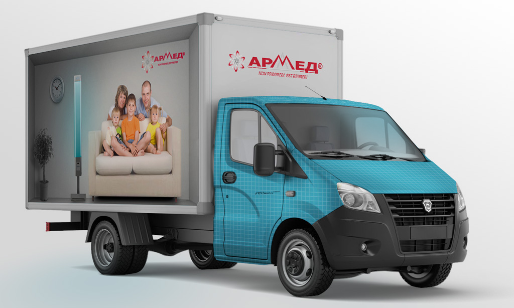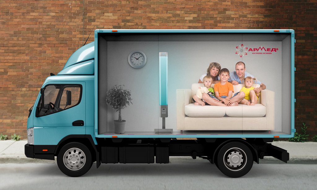 В качестве дополнительной «фишки» нашего проекта сработало добавление 3D-эффекта: мы выполнили макет таким образом, что фургон автомобиля превратился в небольшую объёмную гостиную с предметами интерьера, где и расположились наши герои.