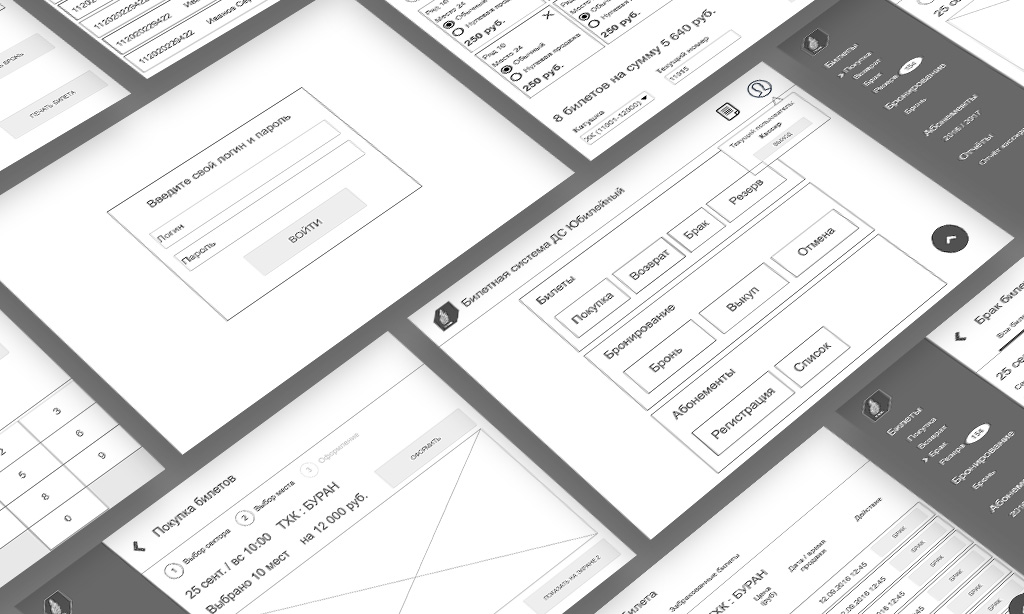 Одновременно, в команде с программистами, разрабатывались информационные модули и навигационные элементы системы: зонирование зала, разбивка зрительских мест по секторам и так далее. Немаловажной дизайнерской задачей была подготовка визуальных шаблонов самих билетов для отображения на дисплеях и для печати на билетном принтере. В общей сложности было создано более 100 шаблонов и дизайн-макетов!