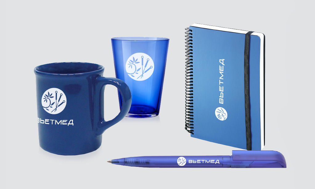 Когда человек идёт на сеанс иглоукалывания, он, как вы понимаете, несколько напряжён. Поэтому всё вокруг должно компенсировать это напряжение своим расслабляющим эффектом. В связи с чем наши дизайнеры начали работу с определения цветовой гаммы, выбрав приятные тёпло-синие тона с отсылкой к фиолетовому. К цветовой гамме мы подобрали идеальные материалы для сувенирной и функциональной продукции. Брендированные тапочки и халаты получились мягкими и домашними. Кружки, блокноты и ручки с логотипами мы также вписали в общий колористический бекграунд, избежав нагромождения графических элементов.