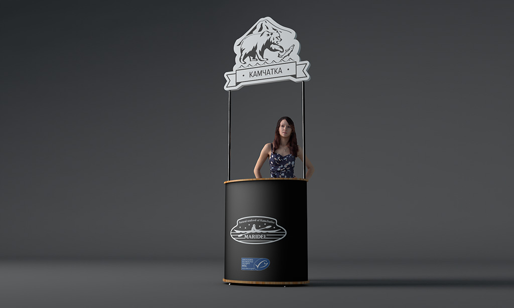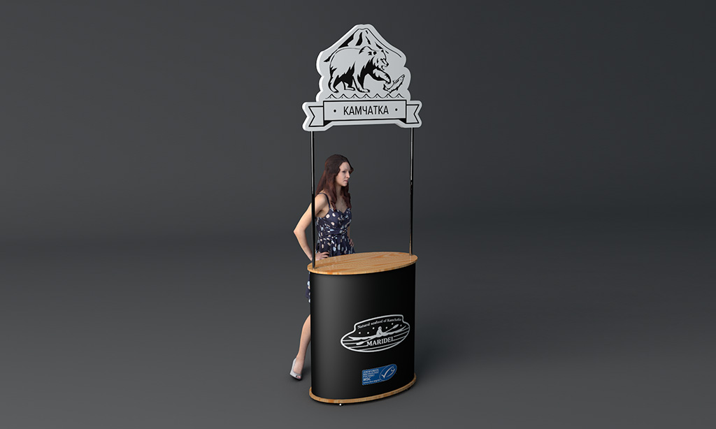 При разработке дизайна промо-стойки особое внимание мы уделили топперу стойки. Мы предложили расположить на топпере имидж, представляющий собой пул наиболее распространенных ассоциаций с Камчаткой — сопка, водная гладь, медведь и, наконец, рыба собственной персоной.