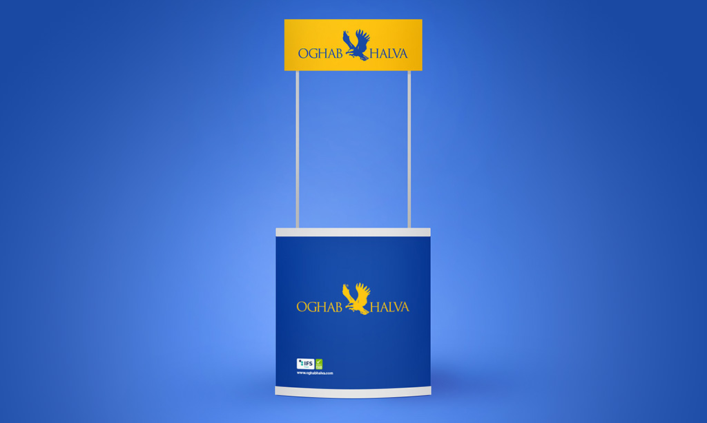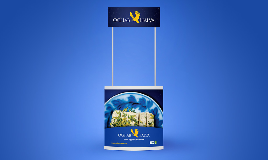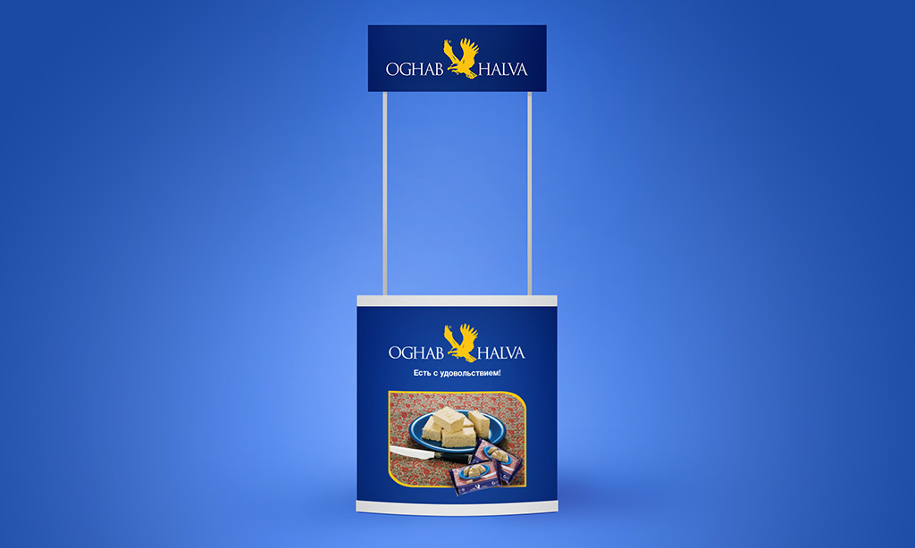 Для привлечения внимания российских покупателей к продукции компании OGHAB HALVA , нами были разработаны и произведены рекламные промо-стойки, а также дополнительные промо-материалы компании. В оформлении ключевую роль играет цветовое решение: несколько оттенков синего, в сочетании с золотом, будут формировать у покупателей ассоциации с изысканными восточным лакомствами.