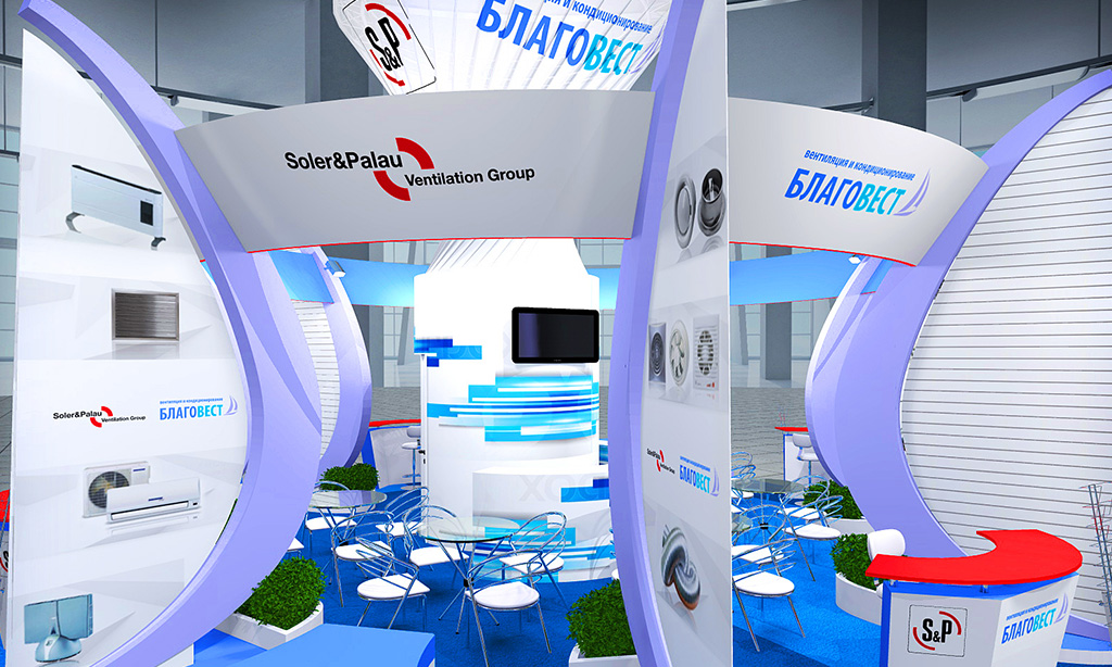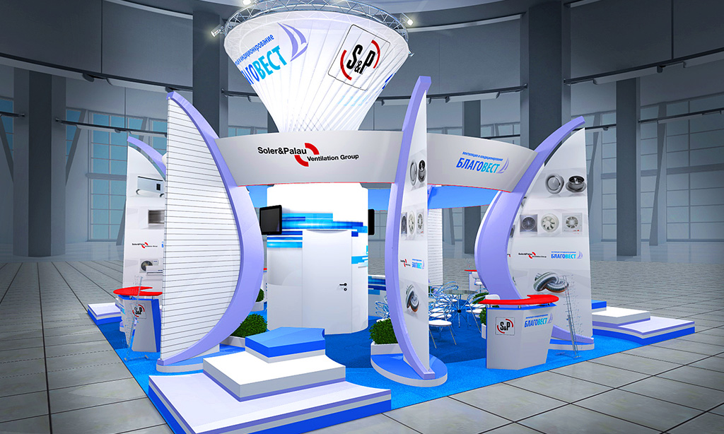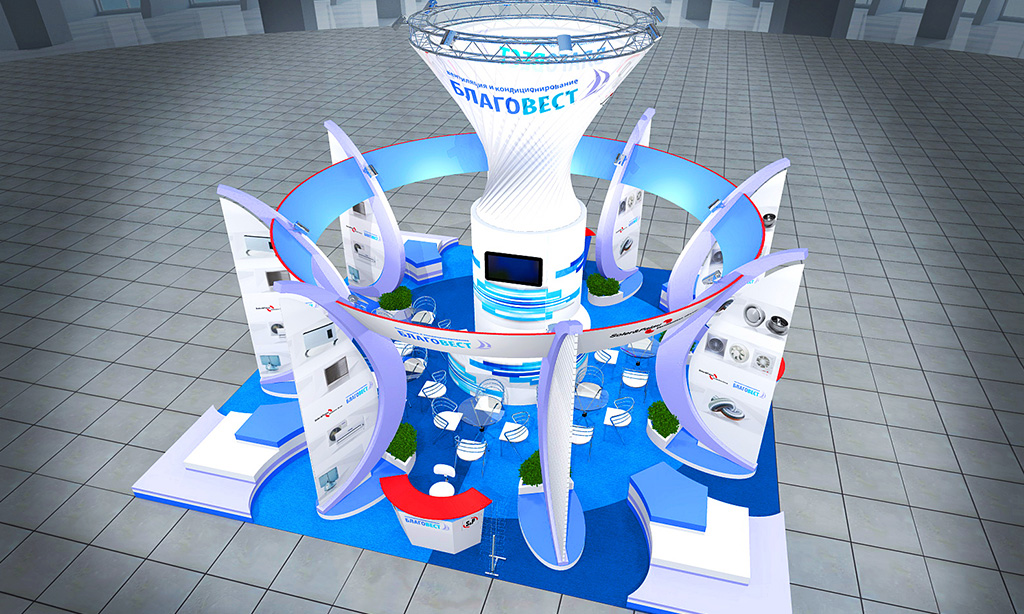В рамках подготовительных работ наши дизайнеры разработали модель выставочного стенда с максимально эффектной организацией пространства. Была обыграна идея вентиляторной системы. Подобная конструкция — и центральная часть и общее расположение элементов стенда — отражает специфику компании-заказчика и подчеркивает индивидуальность.