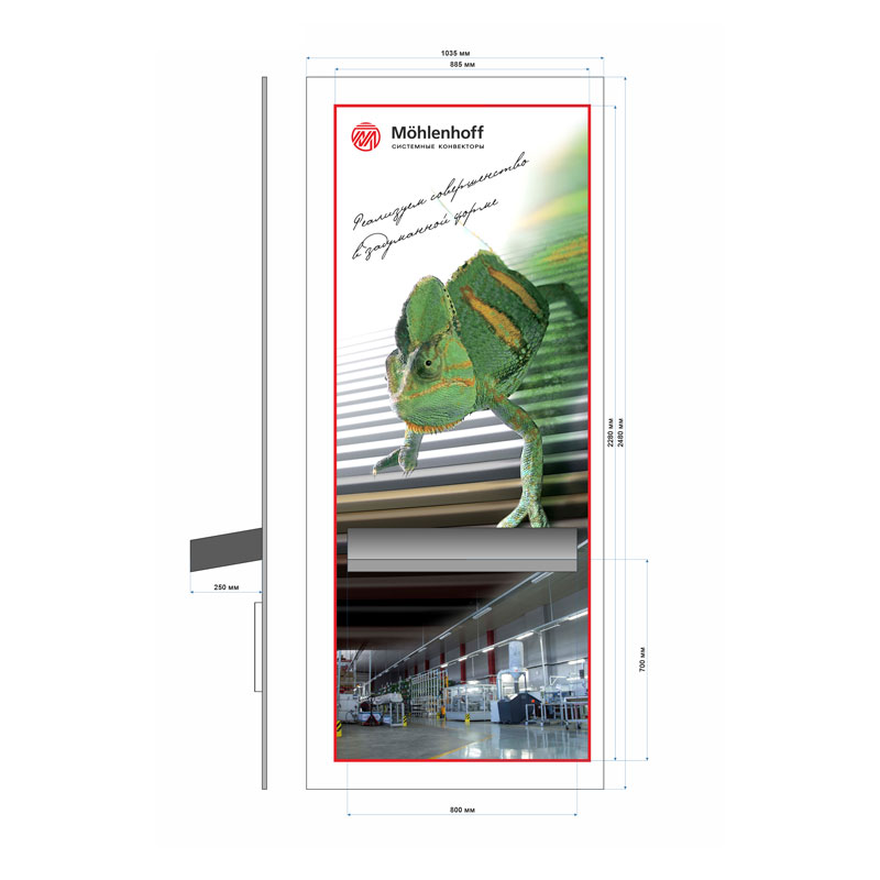 - Рекламные щиты. Данный вид является самым распространённым видом (фото таких можно увидеть в каталоге продукции компании). Такие изделия позволяют отображать как статическую, так и динамическую рекламу. Технология производства позволяет изготавливать рекламные щиты большой (супер-сайты, билборды, стеллы) и малой высоты (тумба, сити-формат).