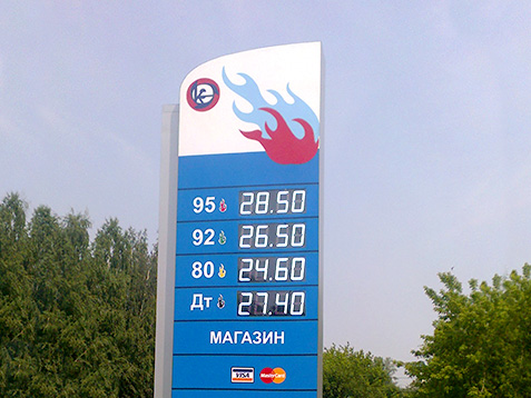 Рекламные стеллы для АЗС — это брендированная конструкция от 3 до 30 метров в высоту. Стеллы АЗС устанавливаются на бетонное основание. Основание рассчитывается каждый раз индивидуально, под конкретную конструкцию — в зависимости от высоты стеллы, это может быть одна или несколько опор. Каркас стеллы для автозаправочных станций производится из металлических профилей, либо, при необходимости, может быть дополнительно усилен полыми трубами. Информационная часть стеллы представляет собой световой короб или светодиодное табло. Также цены на топливо и прочая информация может размещаться на сменных панелях из таких материалов, как ПВХ, металл, и так далее.