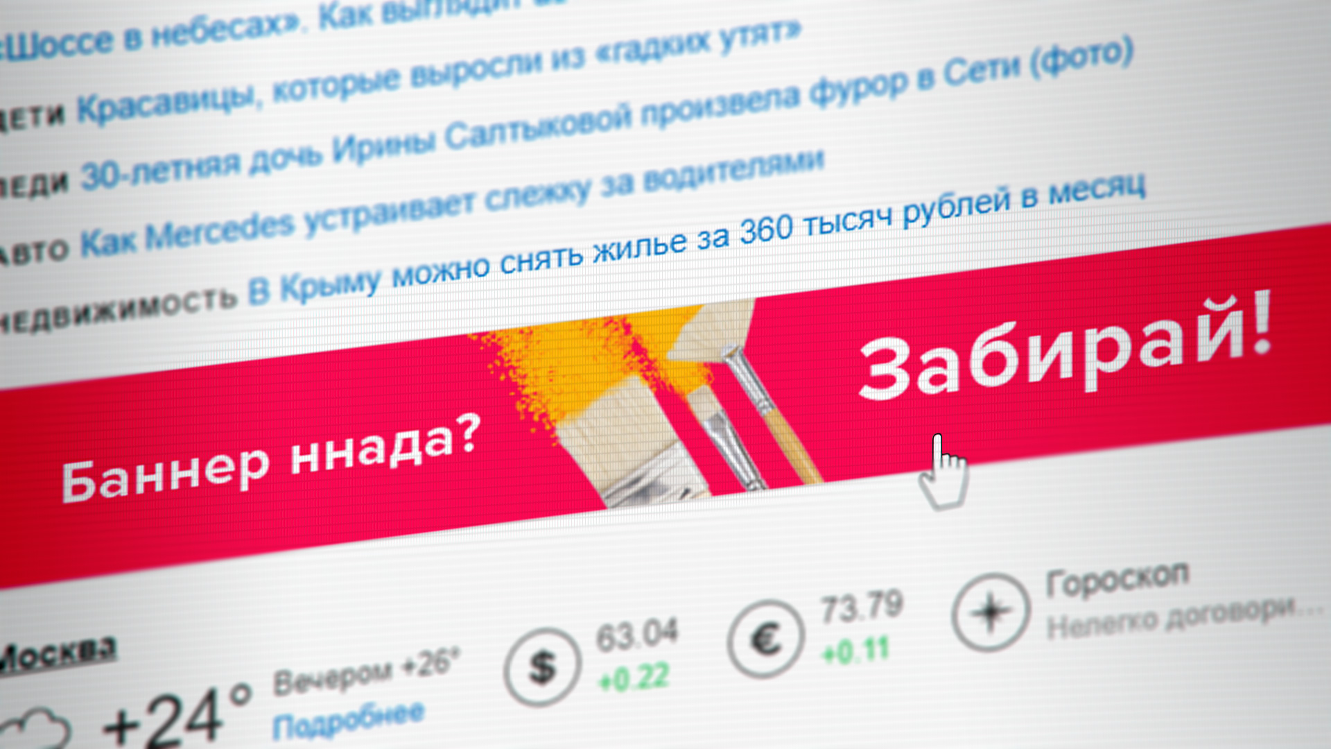 А в это время за тонированными стеклами офисного центра, за спиной девушки, десятки и сотни сотрудников всех уровней и профессиональных сфер «кликают» на баннеры, заказывая доставку суши, контактных линз, оригинальных сувениров и еще всего, чего угодно, или просто для того, чтобы узнать, что же сделала Алла Пугачева, чтобы похудеть на четыреста килограмм за неделю. Все это и есть — четкая и эффективная работа баннерной рекламы на ниве продвижения в сети.