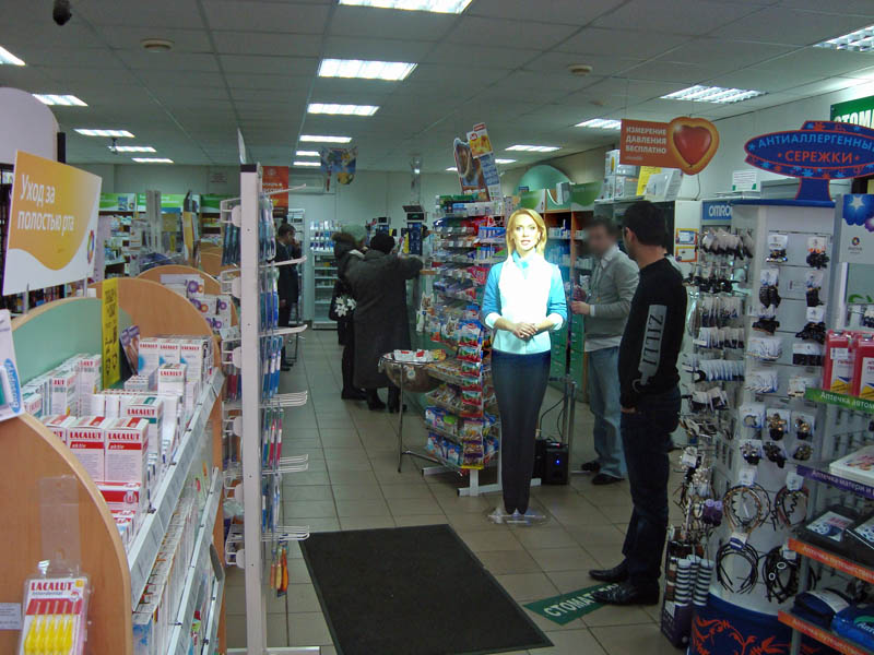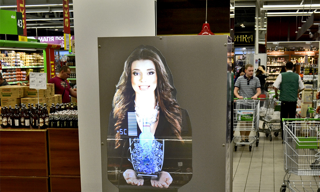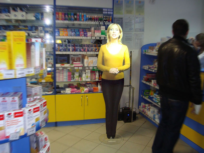 Силуэт виртуального промоутера может быть абсолютно любым — от реального сотрудника Вашей компании до мультипликационного персонажа или даже копии продвигаемого товара. Рекламная компания «Эффект» предлагает Вам также возможность изготовления интерактивного виртуального промоутера. В этом случае для коммуникации с потенциальными пользователями система дополняется интерактивными элементами, такими, как панели touch-screen.