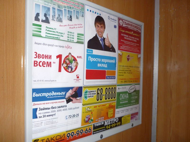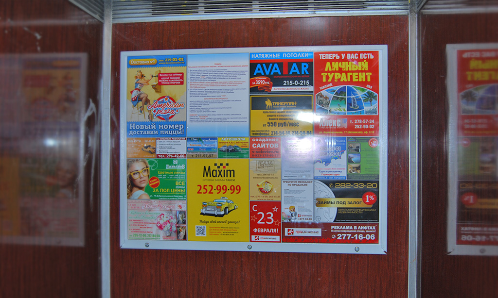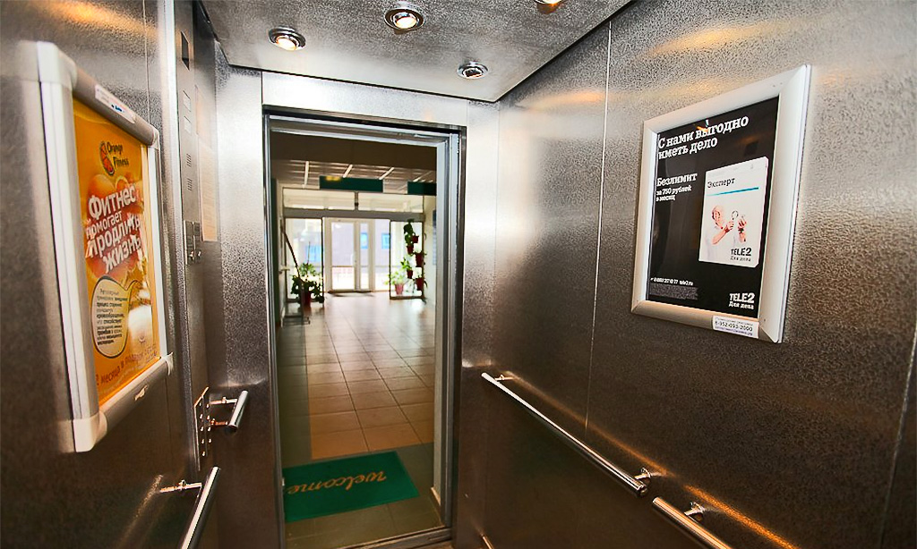 Реклама на стендах в лифтовых кабинах, в отличие от рекламы в лифтах на самоклеящихся стикерах, выглядит гораздо представительнее. К тому же, информационные или рекламные стенды в лифтовых кабинах могут быть дополнительно оборудованы защитной панелью из прозрачного пластика или оргстекла, что позволит сохранить рекламные объявления в целости в течение всего оплаченного периода.