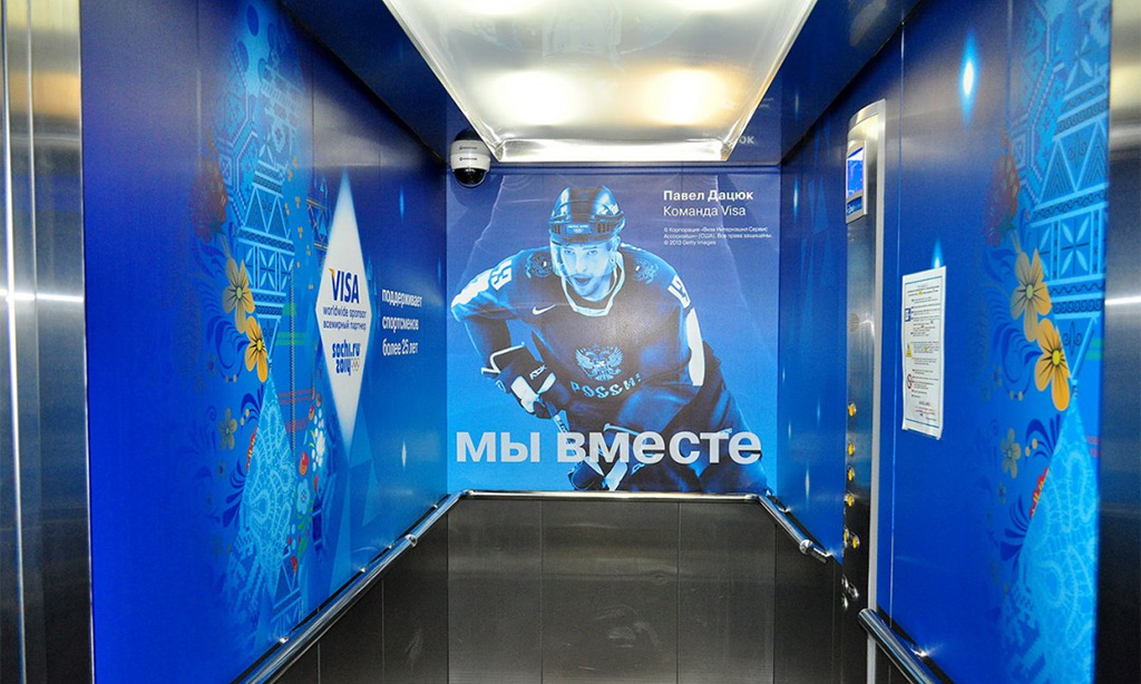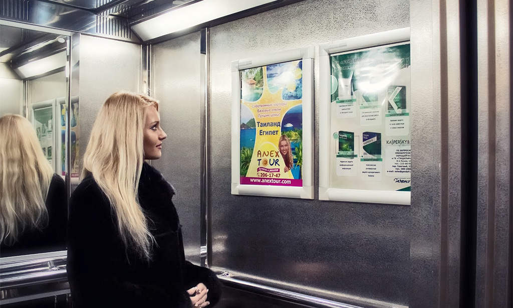 - значительная продолжительность контакта с целевой аудиторией — поездка на лифте, в зависимости от особенностей здания, может длиться больше минуты;