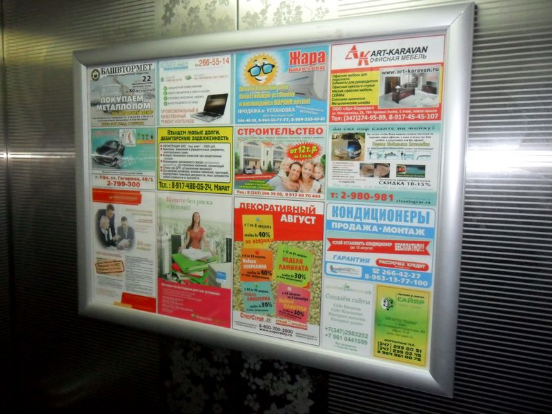Немаловажным фактором является то, что реклама в лифтах является адресной, позволяющей воздействовать на конкретную целевую аудиторию. Рекламно-производственная компания «Эффект» готова предоставить всевозможные услуги по разработке дизайна, производству и размещению рекламы в лифтах, независимо от регионов. Наличие собственного производственного цеха в Москве и современного оборудования позволяет быстро и качественно выполнить заказ по изготовлению подобной рекламы, что может существенно сократить Ваши финансовые и временные расходы на проведение PR кампании. Звоните!