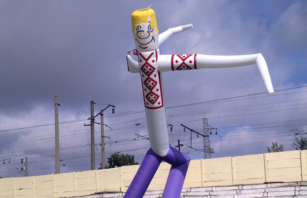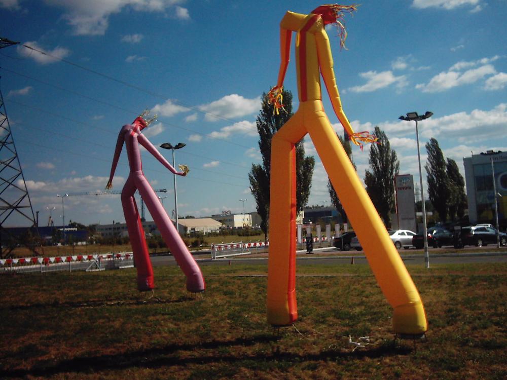 Аэромен или динамическая фигура — это такой объект, произведенный из различных видов резины и, в случаях когда работа аэромена подразумевает нахождение на открытом воздухе не в самых благоприятных погодных условиях, с оболочкой из ПВХ. Динамическая фигура может быть совершенно разных размеров. Тут все зависит только от пространства, бюджета и Ваших пожеланий. Аэромен устанавливается в месте, к которому необходимо привлечь внимание, и к нему подключается специальный компрессор, который наполняет динамическую фигуру воздухом. Но не просто наполняет, а делает это в соответствии с определенным алгоритмом: быстро накачивает максимальное количество воздуха, затем стравливает часть накаченного воздуха и снова доводит заполненность аэромена до максимума. Именно перепады объема воздуха внутри динамической фигуры и приводят к «танцевальным» движениям аэромена. Воздуха много — аэромен выпрямляется, поднимая, например, руки. Воздуха меньше — динамическая фигура оседает, чтобы вскоре снова развернуться. И чем сильнее перепады объема воздуха, тем больше амплитуда движений аэромена.