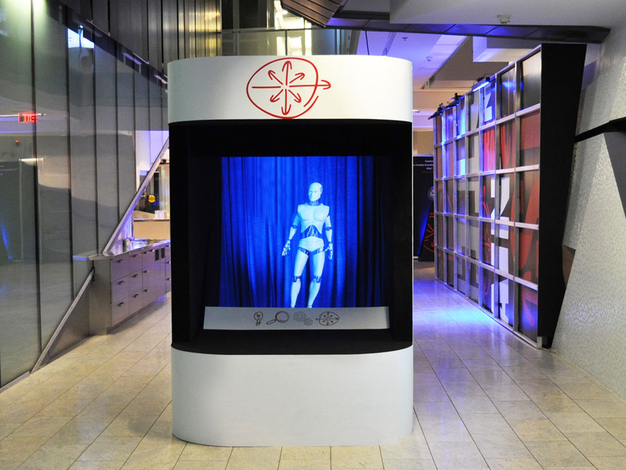 Голографический промоутер может быть наделён интерактивными функциями и вступать в самую настоящую коммуникацию с Вашими потенциальными потребителями. Он может включаться при появлении человека, поворачиваться к этому человеку и говорить, обращаясь именно к посетителю.