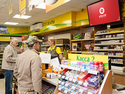 - видеореклама на мониторах, расположенных над кассовыми терминалами